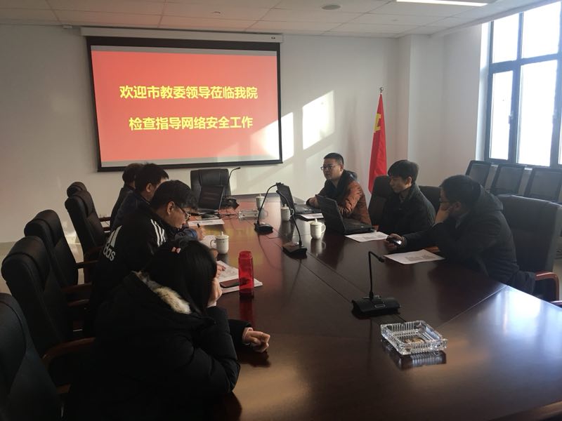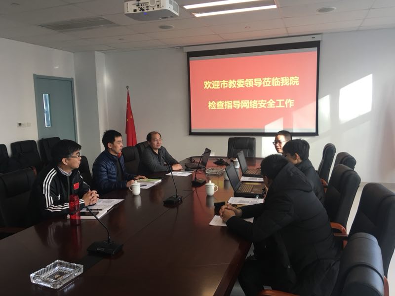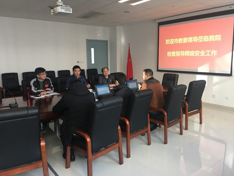 2018年1月18日上午,在新澳门铁盘算二楼会议室,体职院接受市教委信息中心现场检查测试与指导网络信息安全方面的工作。党委书记王伟,副院长刘钦龙,图文信息中心负责人参加检查工作。