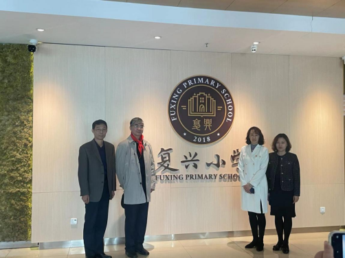 最后,签约授牌仪式结束后,与会嘉宾合影留念。为了表示双方共建共育共享的美好愿景,双方领导在复兴小学logo旁合影。