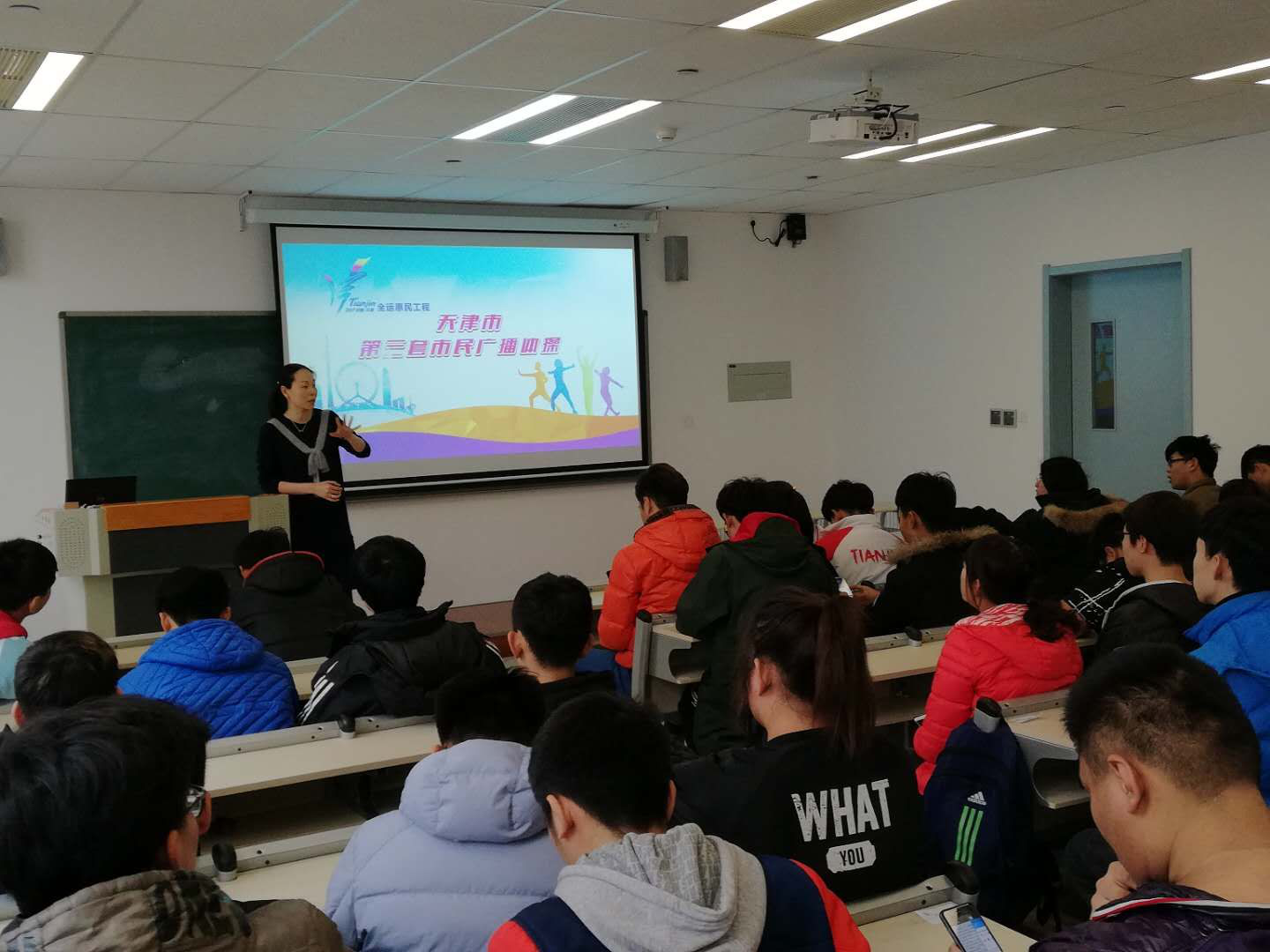 为贯彻落实国务院颁布的《全民健身条例》和《全民健身计划(2016~2020年)》,响应“全运惠民 健康中国”的号召,2018年1月13日,新澳门铁盘算运动训练系学生组织学习第三套广播体操。学习期间学生情绪饱满,动作到位。激发了学生的锻炼热情和对中华民族传统文化的热爱。